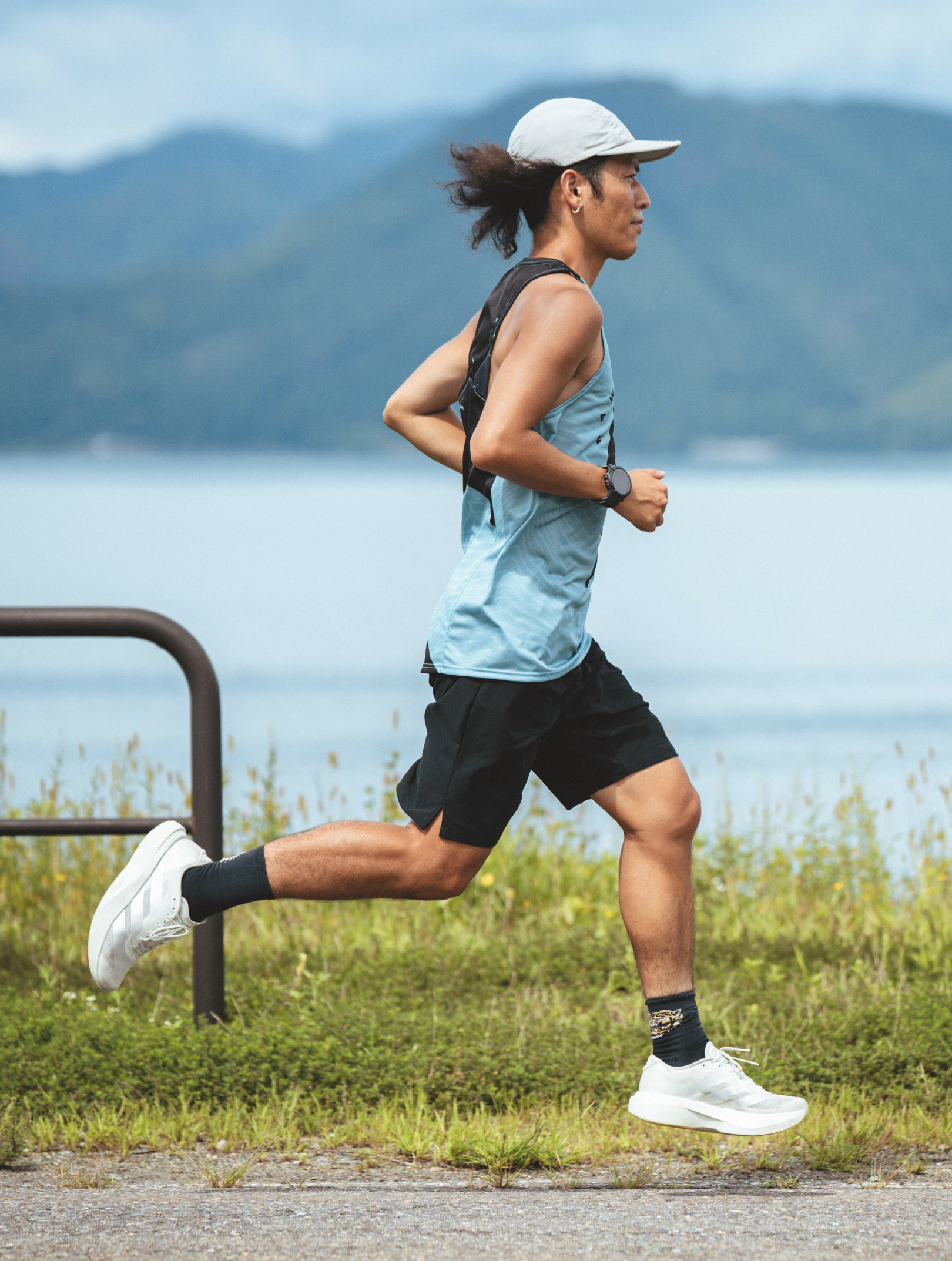 軽量性と速乾性を高める**ユニチカ製 高速乾素材〈ハイグラ®︎〉**を採用したランニングトップ。